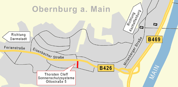 Von der Autobahn A3 Frankfurt/Würzburg kommend, Ausfahrt 57 auf die B469 Richtung Obernburg. Nach ca. 15 km die 3. Ausfahrt Obernburg auf die B426 Richtung Höchst. Nach ca. 500 mtr. links in die Ottostrasse einfahren. 2. Gebäude auf der linken Seite.